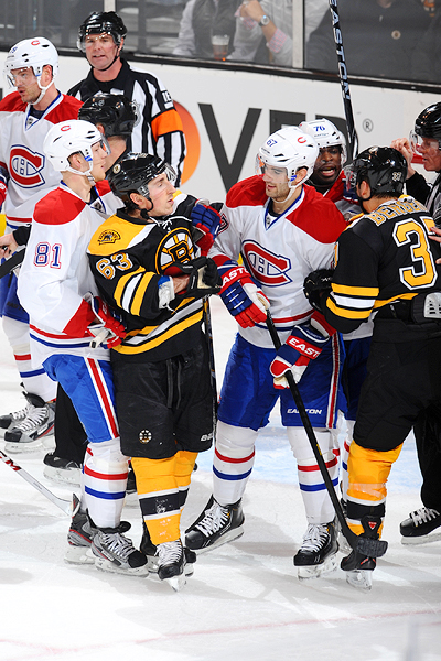 Steve Babineau/Getty ImagesBrad Marchand was in a feisty mood in losing to the Canadiens, but took some solace in the Bruins' scoring output.