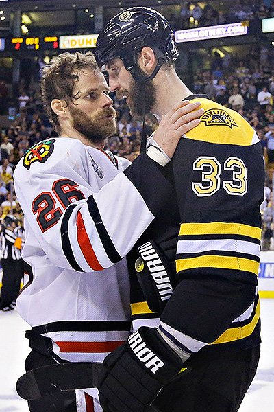 In Monday's Game 6, Chara was on the ice for the Hawks’ first two goals. Out of a faceoff early in the second period, Toews undressed Chara and left him in the dust coming up the boards, swooping in and going five-hole on Tuukka Rask to make it 1-1. Then with less than 80 seconds to go in the contest, Chara couldn't prevent the game-tying goal, with Toews coming out of the corner and slipping a pass through the big defenseman as Bickell went backdoor.