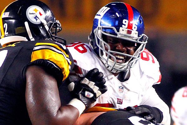 2. Rookie defensive end Michael Buchanan (6-6, 255) was disruptive off the defensive left side, showing good power and multiple pass-rush moves, as well as how his long arms can affect passing lanes for opposing quarterbacks. In addition, he showed strength and technique to effectively set the edge, which is a necessity for any end (4-3) or outside linebacker (3-4) in the team’s scheme. We got a good look at that on the Giants’ second offensive play when Buchanan locked up with pulling guard Chris Snee, held his ground, and kept Wilson hemmed in as he was stopped for a modest 1-yard gain.