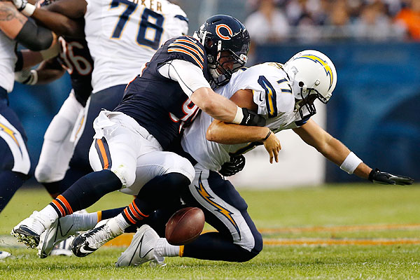 McClellin emerged again on the Chargers’ third possession. He got past left tackle Max Starks and nailed Rivers from behind. The hit caused Rivers to fumble the ball, and the Bears recovered it.