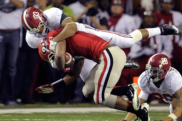 Yes, possibly the worst call in national title-game history happened on the game's first punt, when Notre Dame recovered a Christion Jones fumble and the officials threw an illegal contact flag even though it was another Tide player who bumped into Jones. But there is no mistaking that Alabama is taking it right to Notre Dame, from T.J. Yeldon turning a Manti Te'o missed backfield tackle into a 10-yard gain, to Eddie Lacy tossing Danny Spond aside and getting a five-yard rush.