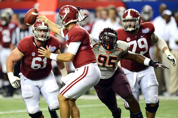 Communication issues, first-game jitters, blown assignments and an aggressive Virginia Tech front seven caused Alabama's line to look dazed for most of the night. McCarron was only sacked once, but he spent a lot of his time running around to avoid pressure. He only completed 10 of his 23 pass attempts and found himself late on a few easy throws.
