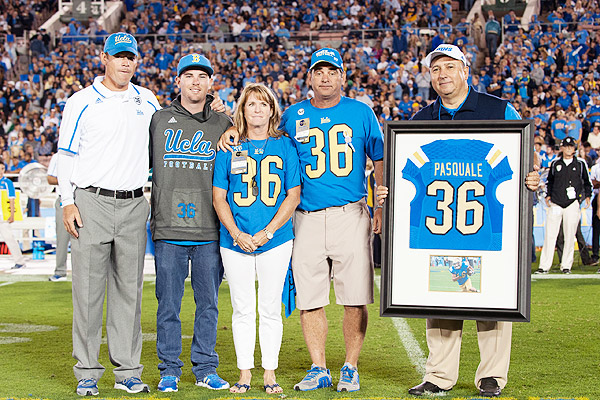 According to the Pasquale family, Mora has done everything possible to ease their pain and to draw them closer to the UCLA football family. The family attended Saturday night's game against New Mexico State, where the Rose Bowl field featured Nick Pasquale's No. 36 jersey number. Mora has retired the number for the foreseeable future, has renamed the scout team award in Pasquale's honor, and allowed the Bruins, with his blessing, to run their first offensive play with just 10 players.