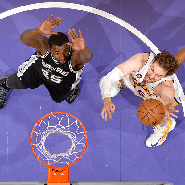 Finally, with Tim Duncan out of the game, Gasol had a little room to work. With 4:17 to go, he made a graceful left-handed hook shot to cut the lead to 19.